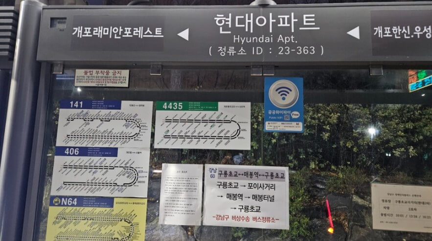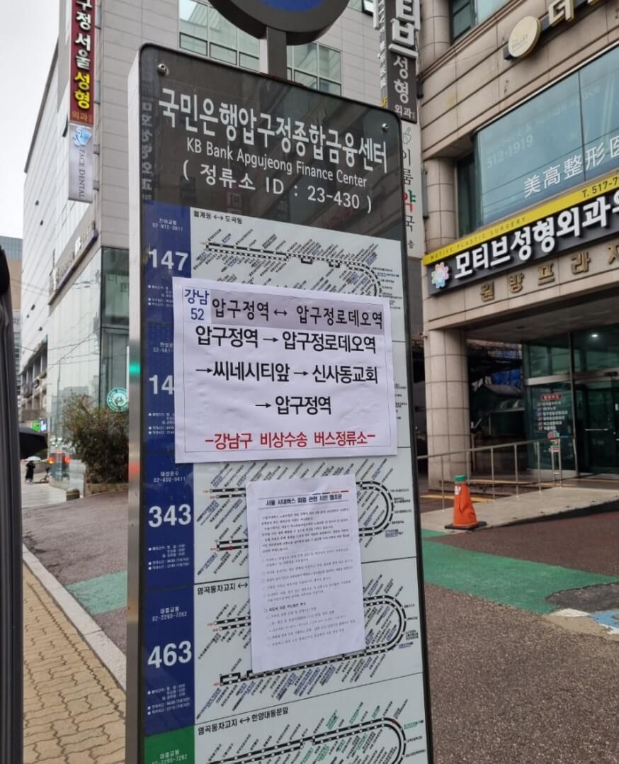 탑승 가능한 버스 정거장에는 아래 사진과 같이 '강남구 비상수송 버스정류소'라고 안내문구가 붙어있습니다.