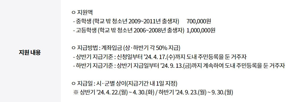 - 상반기 지급기준 : 신청일부터 24.04.17 (수요일)까지 도내 주민등록을 둔 거주자