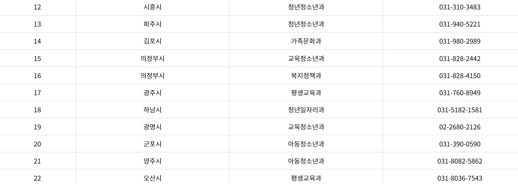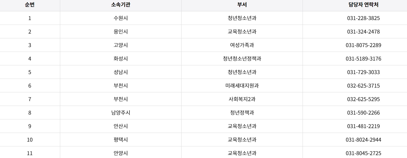 경기도 청소년 생활장학금에 대해 궁금한 사항이 있으신 분들은 각 시 ·군별 담당자 연락처를 보시고 확인하시고 문의하시면 됩니다.