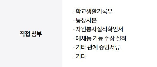 - 선택(가점대상) : 최근 3년간 예체기능 수상 증빙자료, 자원봉사 실적확인서