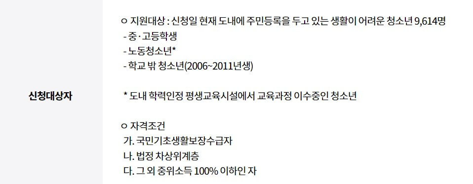 지원대상 : 신청일 현재 도내에 주민등록을 두고 있는 생활이 어려운 청소년 9,614명