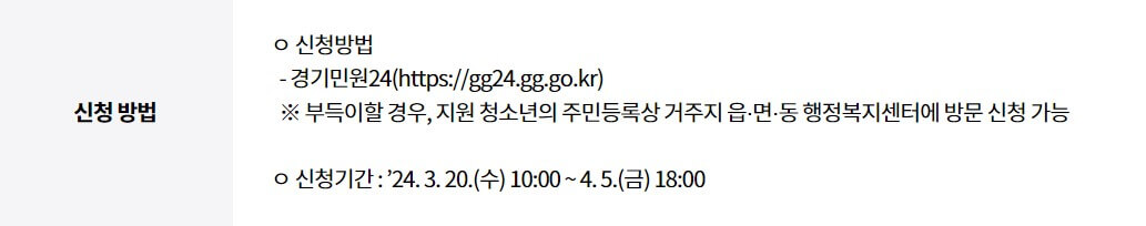 - 신청문의 : 시 ·군 청소년 담당 부서 및 관할 읍면동 행정복지센터