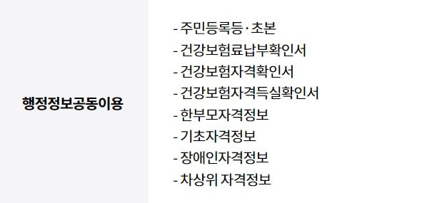 - 행정정보공동이용 자동연계 : 지원 청소년 주민등록등초본, 기초생활보장수급자, 법정 차상위, 한부모자격정보, 건강보험자격확인서, 건강보험료납부 확인서