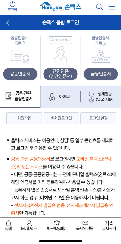 1. 국세청 홈택스 검색 후 공동인증서나 간편 인증 등 로그인해 주세요.