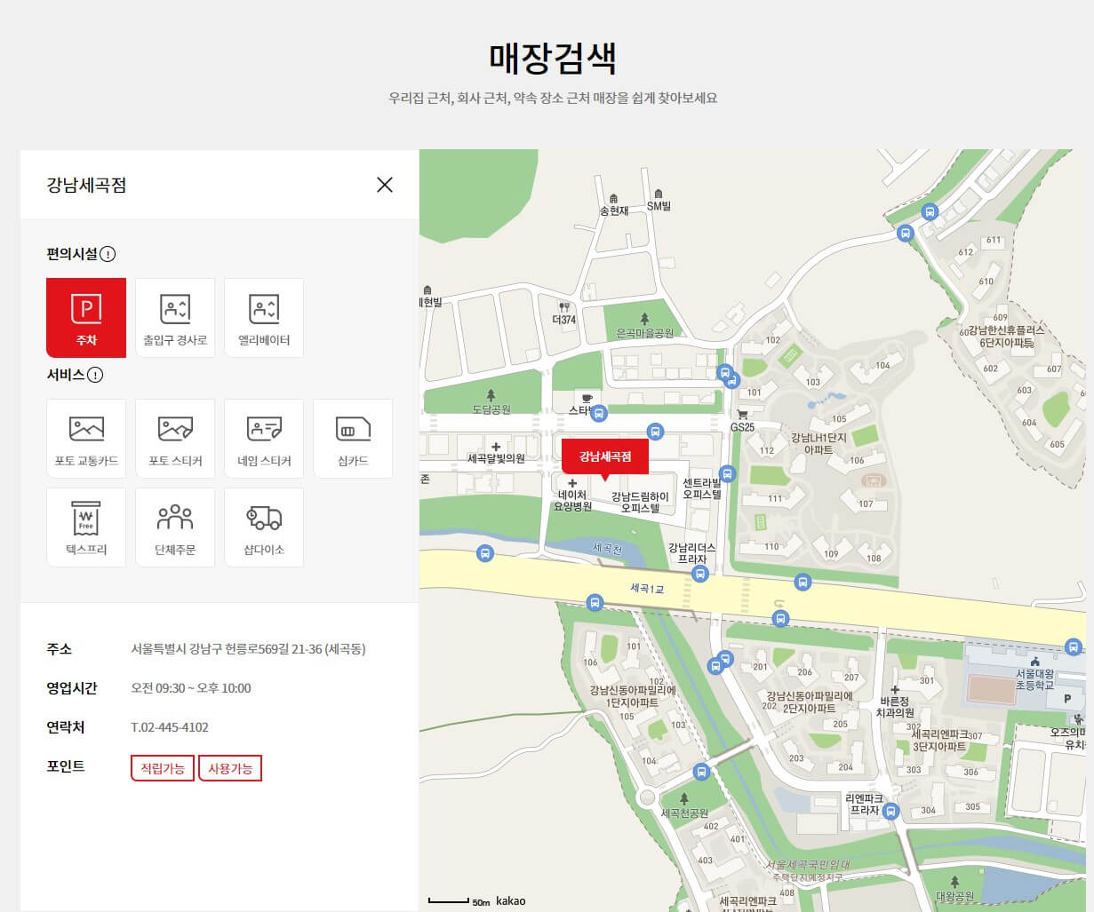 찾는 매장을 검색하시면 다음과 같은 각 매장의 다양한 정보를 찾아보실 수 있습니다.