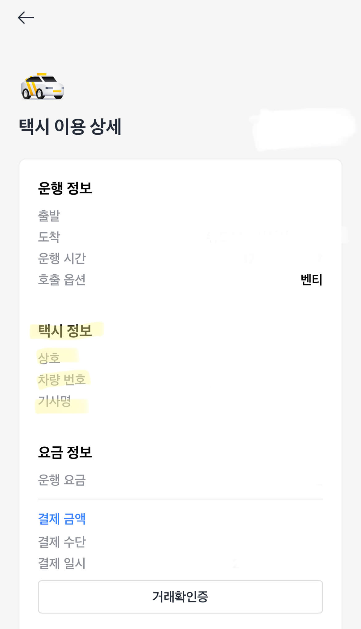 - 결제택시 차량번호와 택시 운전자 연락처 정보 확인하기