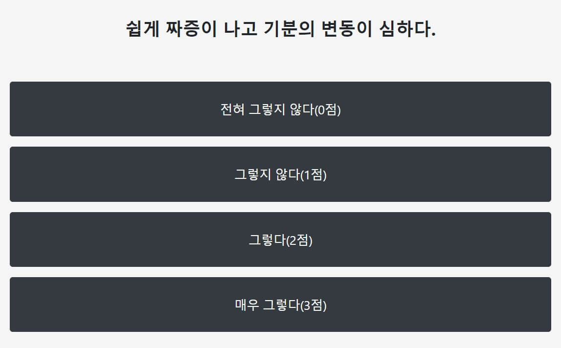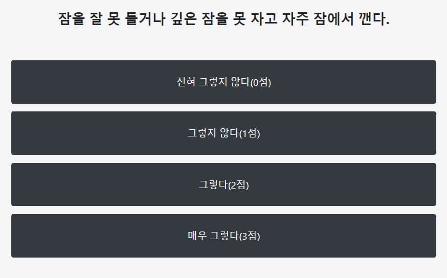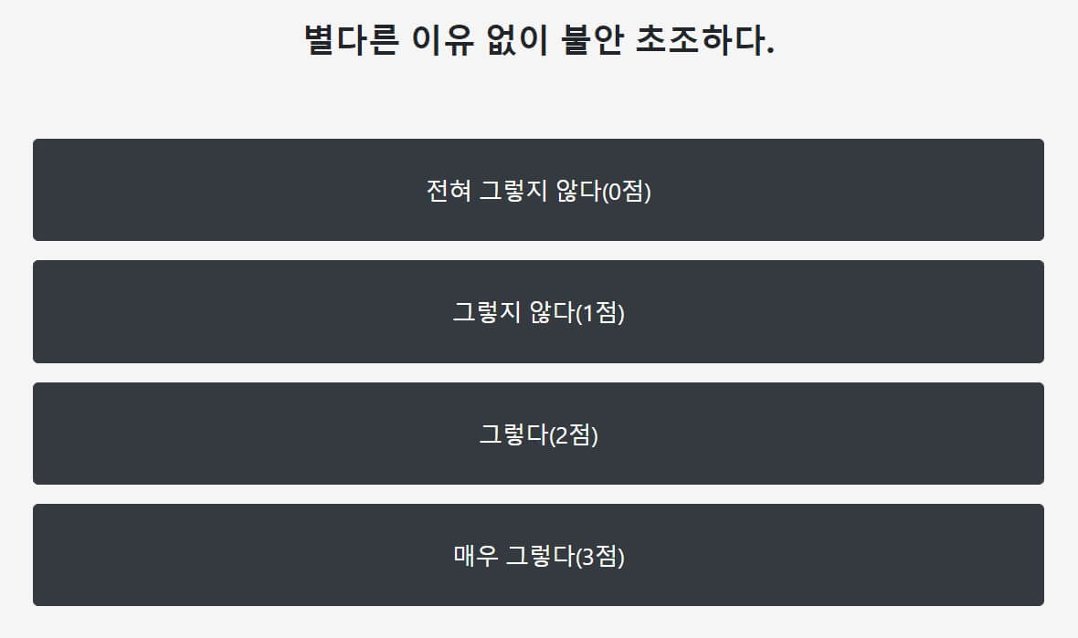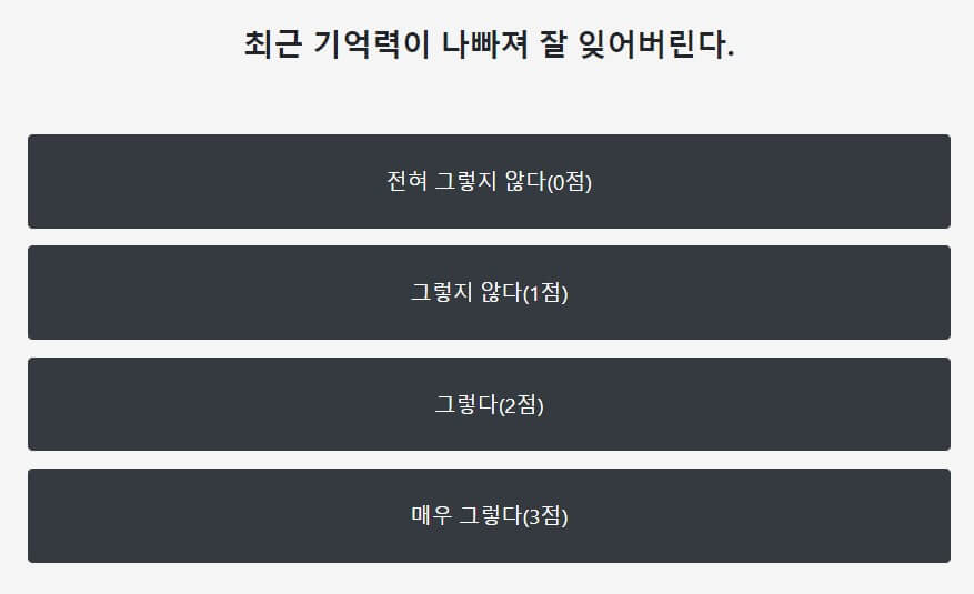 테스트 방식은 문항을 보고 해당하는 답변을 고르면 되는 방식이다.