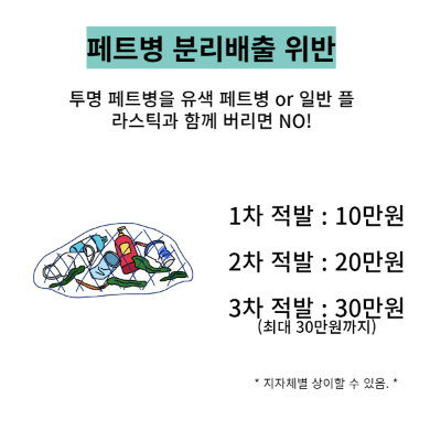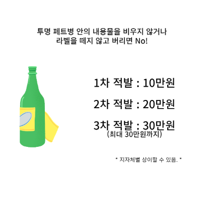 - 투명페트병을 유색페트병과 일반 플라스틱과 같이 버릴 시 과태료 최대 30만 원까지 부과됩니다.
