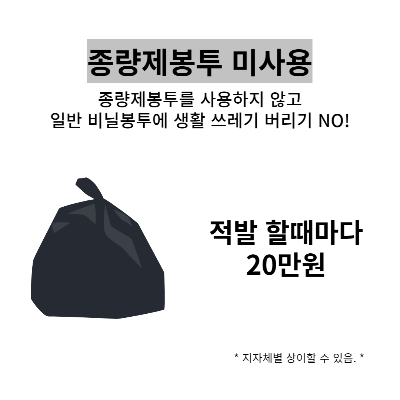 - 종량제봉투를 사용하지 않고 그냥 일반 비낼봉투에 생활쓰레기들을 버리게 된다면 발견될 때마다 20만 원씩 과태료 부과됩니다.