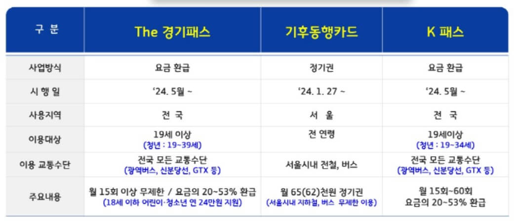 ① 월 15회 이상 무제한 ② 광역스, 신분당선, GTX(광역급행철도), 모든 대중교통수단 사용가능 *단,고속버스,KTX등 발권받는 교통수단은 제외* ③ 18세 이하 어린이·청소년들에게도 교통비 지원 ④ 요금 환급 |