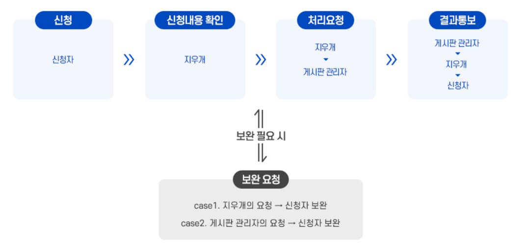 게시물 블라인드 처리는 하지만, 검색 포털의 검색결과에 계속해서 노출이 되거나, 게시판 운영 사업자의 폐업 등으로 삭제가 어려운 경우 더 이상 검색결과에 나타나지 않도록 요청함.