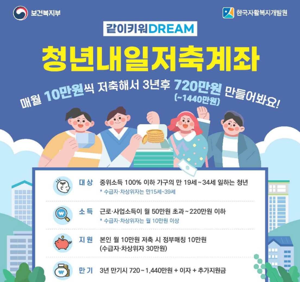 청년들의 목돈마련에 도움을 주는 청년내일저축계좌, 다가오는 5월 1일부터 모집할 예정이니 다음 내용들을 꼼꼼히 확인하고 신청해 자산 불리는 것에 조금이라도 도움이 되었으면 좋겠습니다.