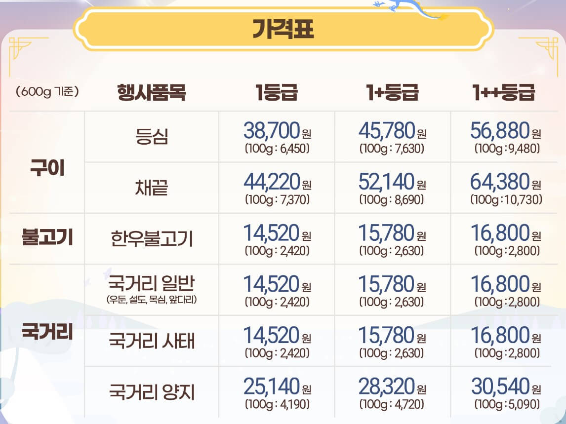등급은 각각 1등급, 1+등급, 1++등급으로 분류되고 600g 당 가격이 투명하게 공시되어 있습니다!