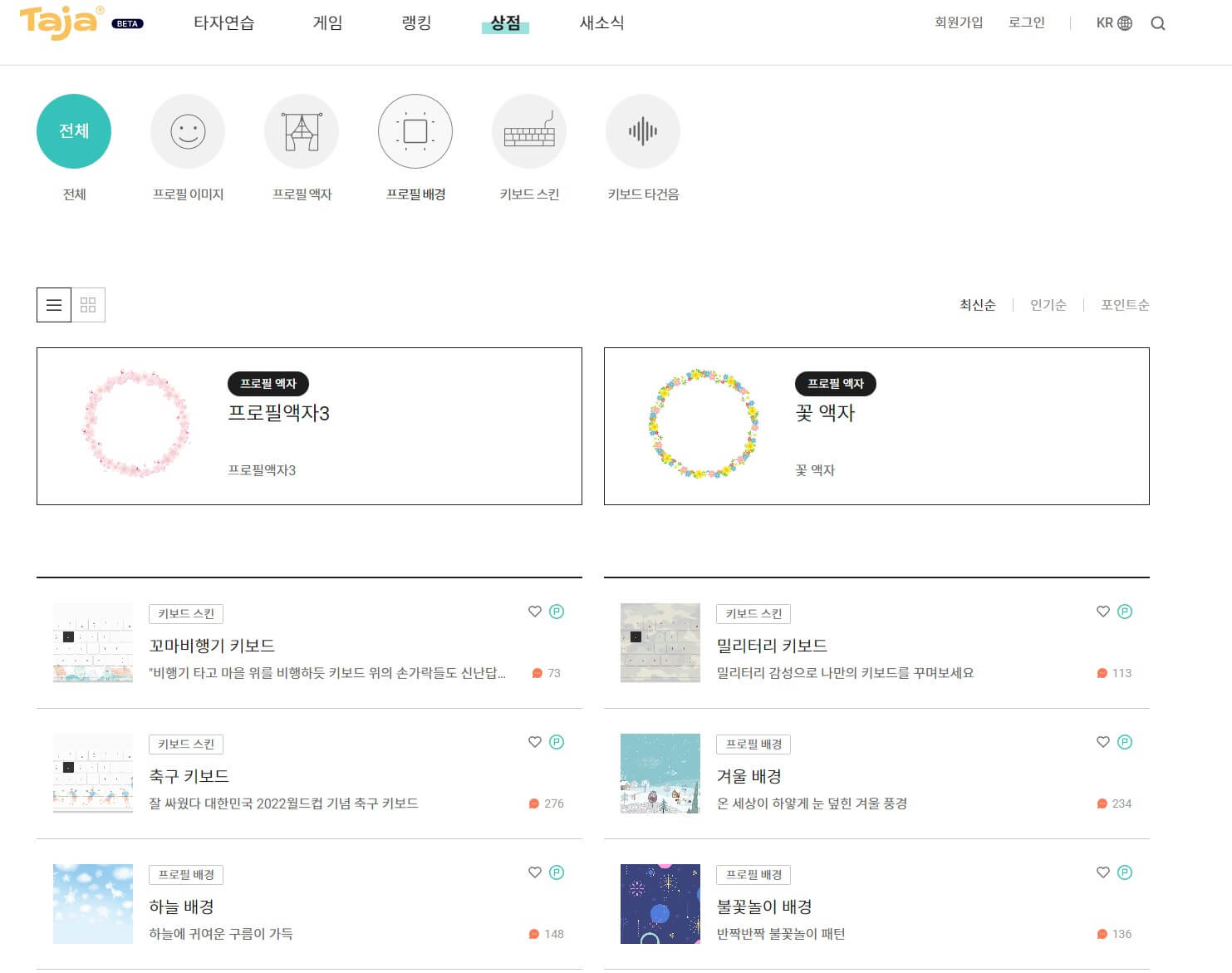 이렇게 포인트를 모아 살 수 있는 상점 같은 것이 있어 더욱더 재미있습니다. 스킨과 배경들도 귀여운 것들이 많아 타자연습으로 타자 실력도 늘리고 재미도 얻으면서 일석이조가 될 수 있겠습니다.