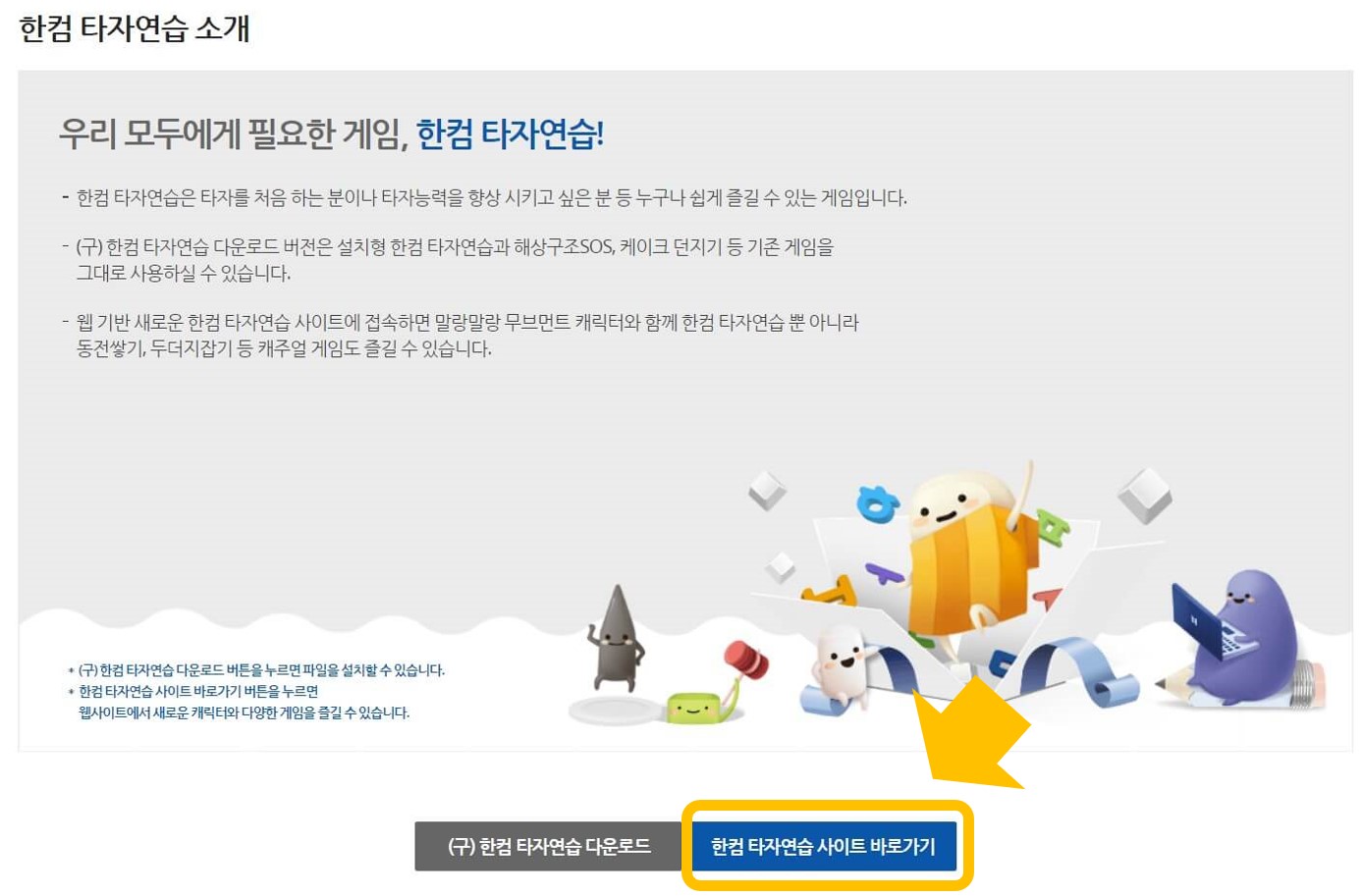 검색창에 <타자연습 or 한컴 타자연습>이라고 치면 상단에 사이트가 나옵니다. 한컴 타자연습 홈페이지를 들어가면 바로 위와 같은 페이지가 나오게 됩니다. 그럼 '한컴 타자연습 사이트 바로가기'를 눌러주면 됩니다.