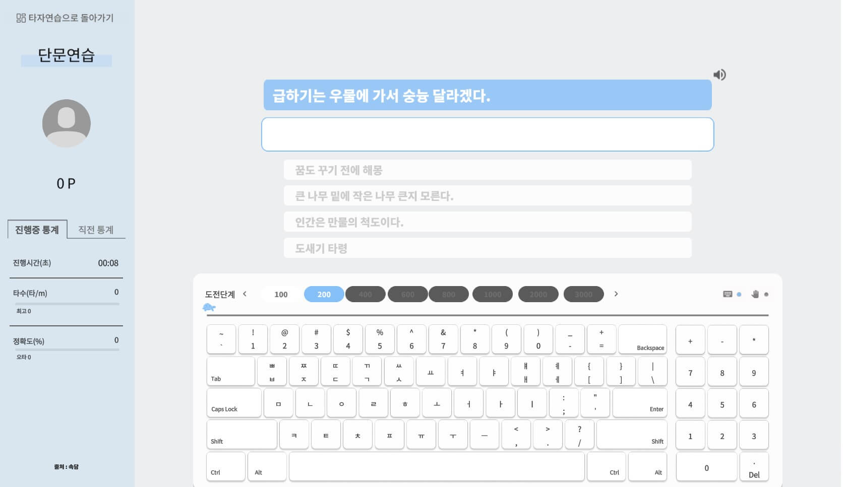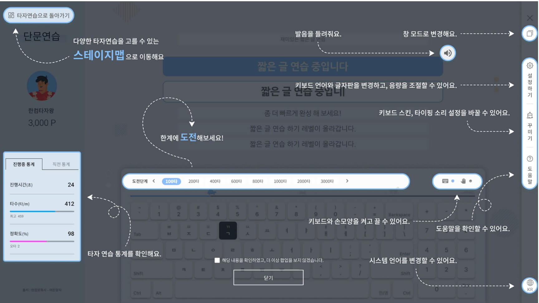 확실히 연습하니 금방 늘긴 하더라고요. 최근에는 로그인해서 진행하면 포인트가 쌓여서 예쁜 키보드 스킨 같은 것들을 살 수 있어서 포인트 모으는 재미요소를 넣어놨습니다. 포인트 모으는 재미가 있습니다.