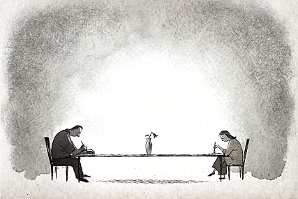 두 사람은 긴 테이블의 양쪽 끝에 앉아 서로를 쳐다보지도 않고 식사를 하는 듯 마는 듯 하지만 속으론 서로에게 비난의 화살을 쏘아대며 치열하게 싸우고 있다.