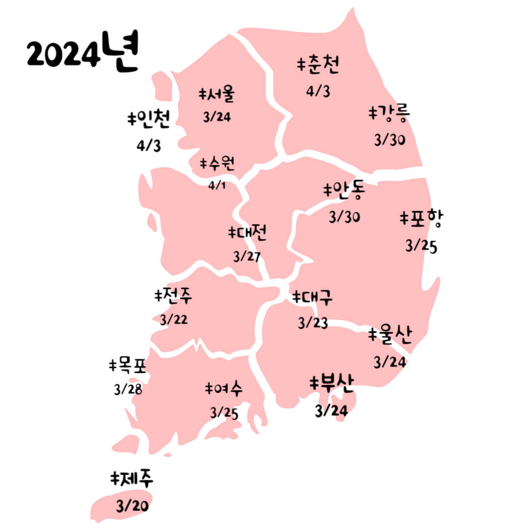 지역별로 개화시기입니다. 기후변화로 인해 확 당겨졌지만 날씨변화로 인해 개화시기가 변경될 수 있으니 참고하시기 바랍니다.
