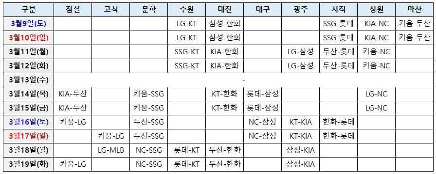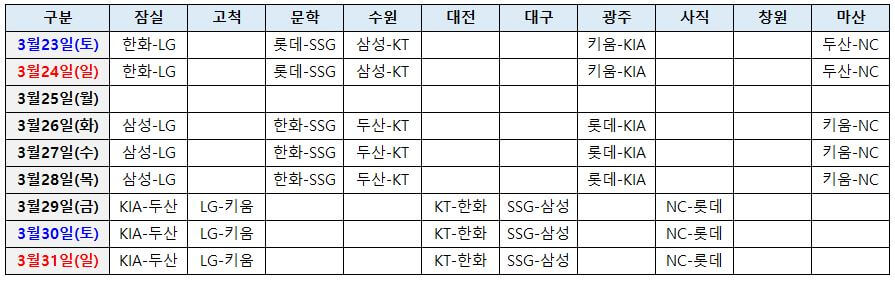 2024 프로야구 3월 경기 일정은 아래를 참고하세요